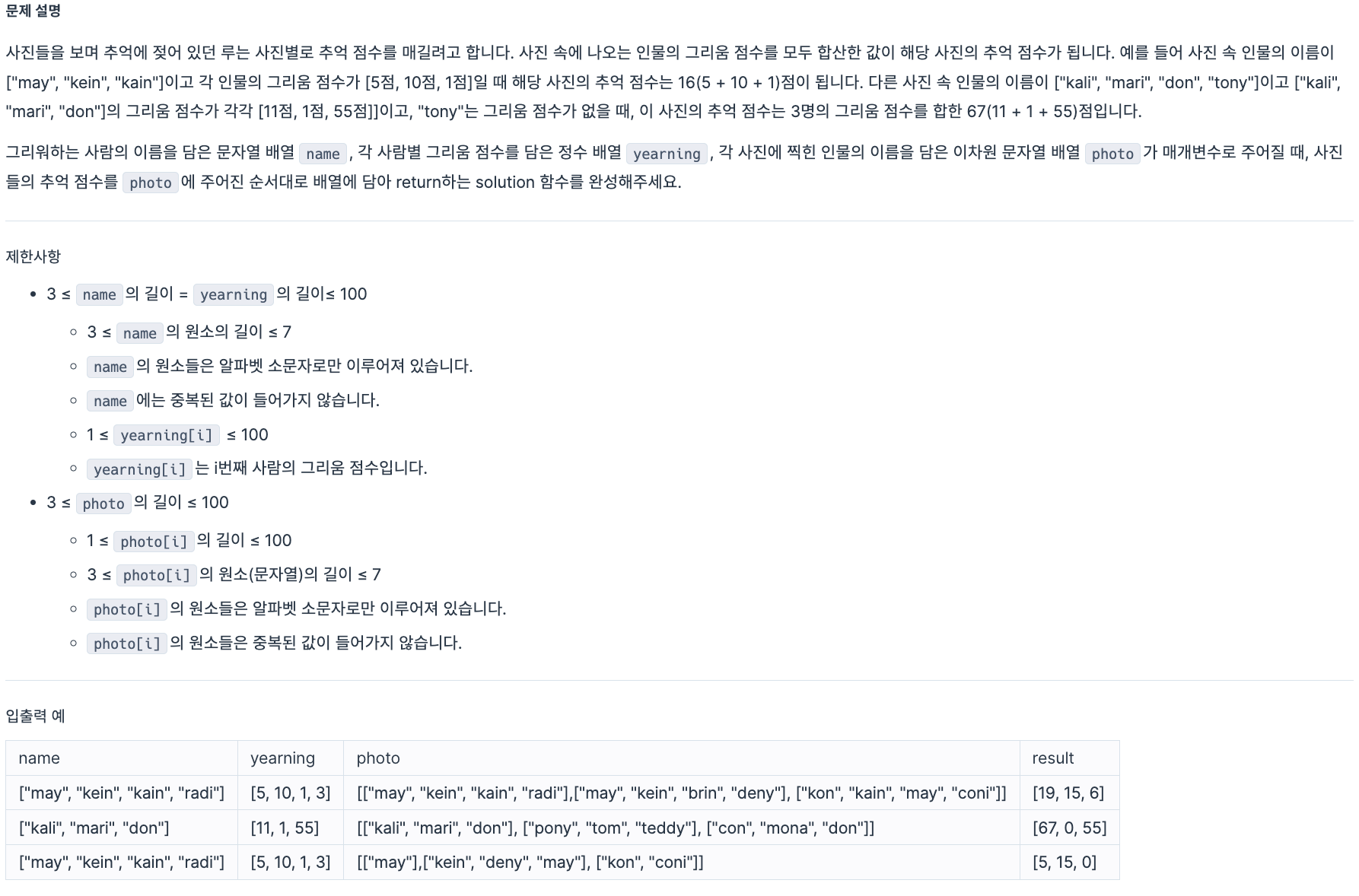 def solution(name, yearning, photo):