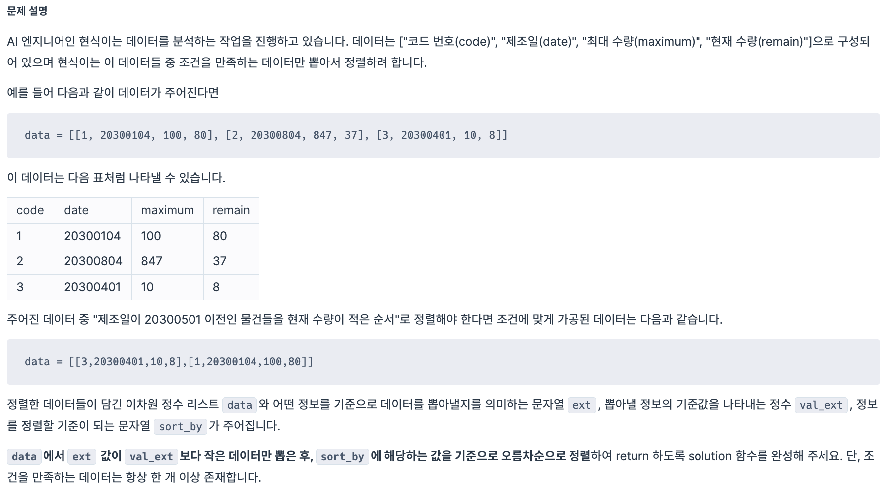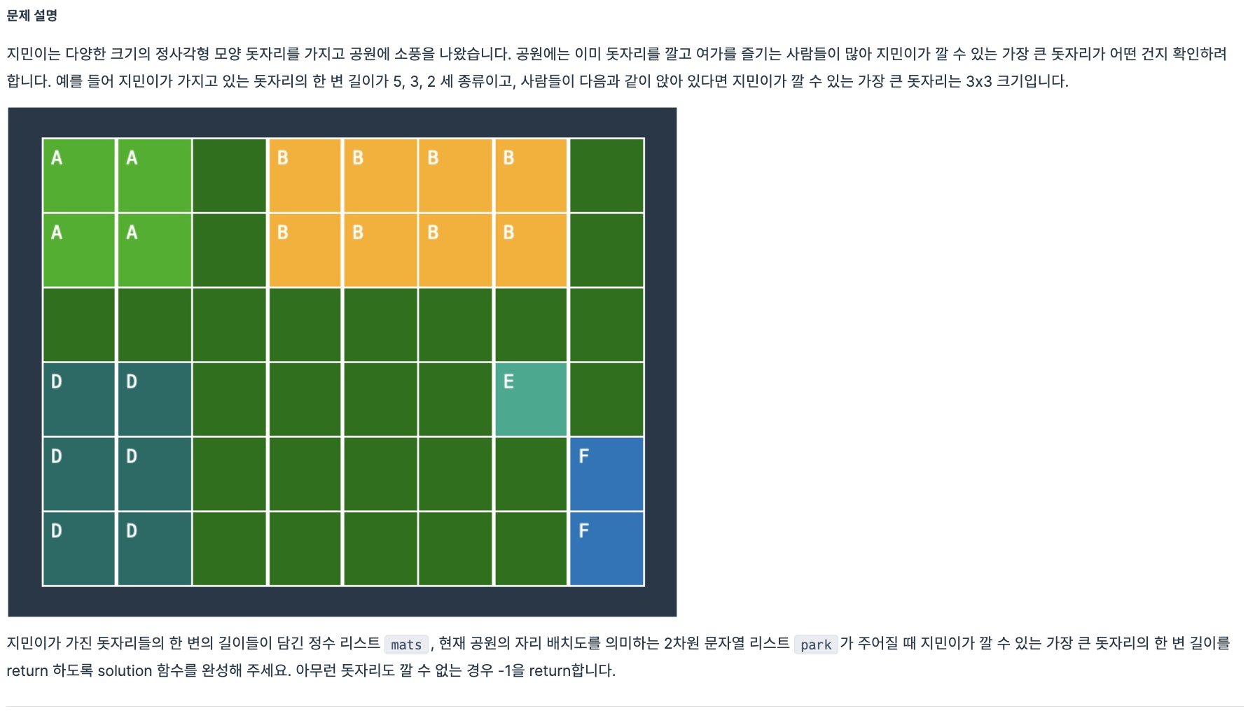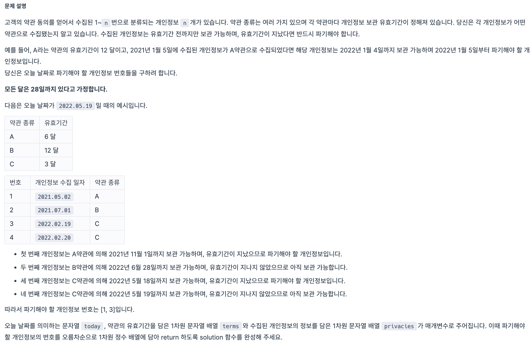 ✏️ 문제 문제 파악문제 자체가 연도, 월, 일을 가지고 말하는 것이기 때문에 12월이 넘었는지, 28일이 넘었는지 처리를 잘해주어야 한다. ~에 해당하면 ~를 매치해주어야할 때 딕셔너리만큼 편한 것이 없어서 약관 종류와 유효기간을 다룰 때 딕셔너리를 활용해서 풀었다. 이 문제를 풀었다면 더 확장된 문제인 1번 동영상 재생기 문제를 풀어보면 좋을 것 같다! 코드def solution(today, terms, privacies): answer = [] term_dict = {} cur_year, cur_month, cur_day = map(int, today.split('.')) for term in terms: key, value = term.split() ..